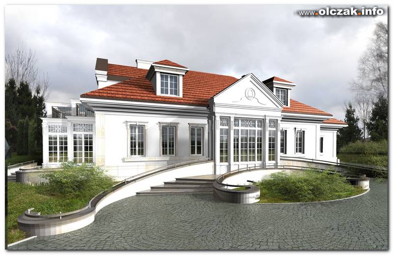 tutaj propozycja z pełnym zabudowanym przedsionkiem pod portykiem oraz lukarnami z owalnymi oknami