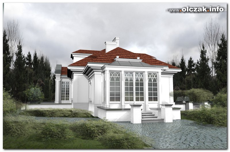 Kolejny wariant projektu zakładał rozbudowę salonu o mocno zdobiony i stylizowany ogród zimowy.