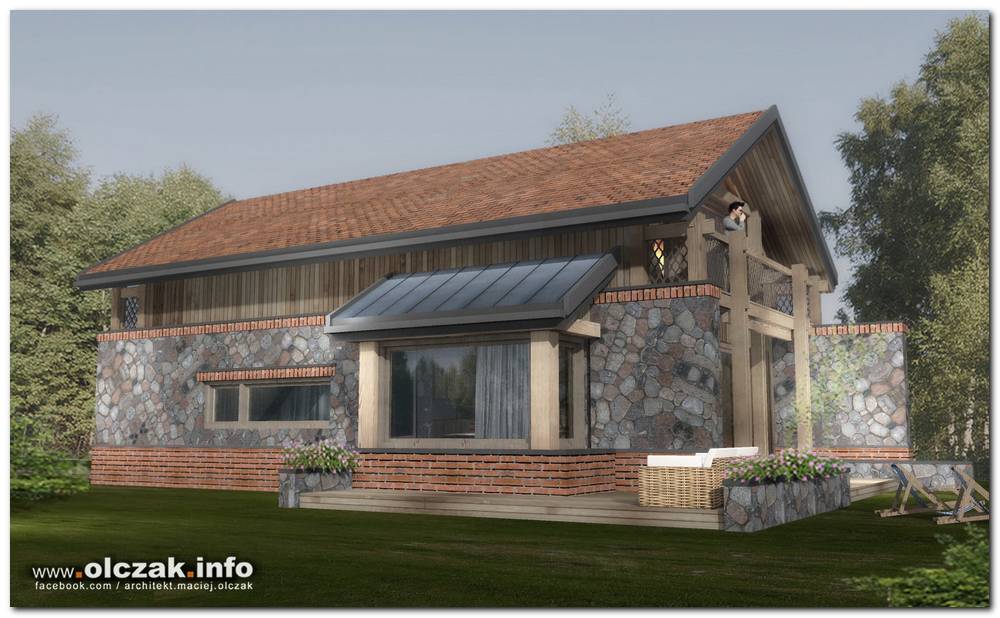 Widok domu od strony jeziora, przeszklony ogród zimowy, lukarna z oknem balkonowym i widokiem na jezioro, cokół i ścianki oporowe z kamienia polnego ciętego, ściany z czerwonej cegły rozbiórkowej.