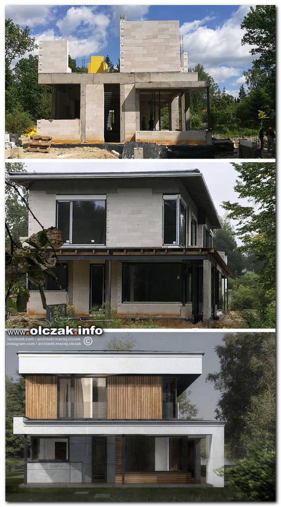 Zdjęcie zrealizowanej nowoczesnej willi, na piętrze deski elewacyjne w brązowym kolorze dopełniają prostą bryłę domu nutką nienachalnej elegancji. ![]() Zdjęcie z budowy nwowczesnej rezydencji - salon z przeszkleniem w formie ogrodu zimowego. ![]() Zdjęcie prezentujące postęp prac, stan surowy otwarty, stan surowy zamknięty i wizualizacja planowanej wersji ostatecznej. ![]() Realizowana fasada nowoczesnej willi, połączenie brązowej szalówki, białego tynku i płyt z włókno-cementu.